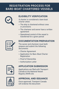 Applications are filed with Transport Canada at the NVRC site, and the vessel itself can be registered in Canada for domestic chartering, or registered under foreign flag for international operations.